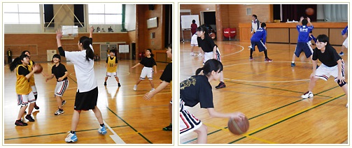 その後、パスやドリブル、シュートの指導がされました。現役時代、プロ選手の中では比較的身長が低かった田中氏は、ボールを受けてからシュートを打つまでの時間を早めることを意識していたといい、準備姿勢や動作の大切さを伝えました。最後には、田中氏を交え、5分制の試合を男女交互に実施しました。田中氏が見せるスーパープレーに驚嘆の声をあげつつも、指導された内容を早速実践に移している生徒が多く、指導の効果を実感している様子が垣間見えました。クーリングダウンをしたのち、「選手として成長するためには、自分の中で誰かライバルを作り、その人を目標にして練習することが重要」というメッセージが送られました。