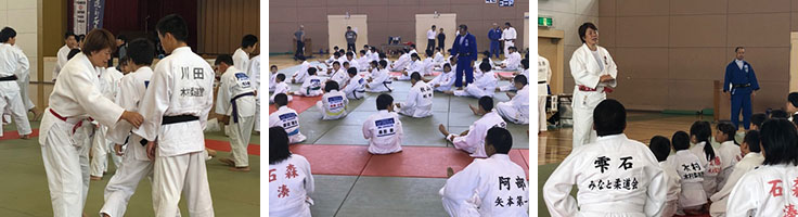 今回で4回目の参加になる田辺氏は、対象年齢が幅広かったことから、どの年代にも必要不可欠な基本的な技術指導に重点を置いて、普段の練習に戻った後の練習に役立つようにポイントごとで丁寧に説明されていました。また準備体操の後、発育発達の時期を考えて、ケガの予防や自分の体重での様々な動きによるトレーニングに対応するためにアニマルウォークを取り入れたトレーニングを行いました。終盤には「立技乱取」を行い、参加者たちは今日学んだ技を実戦形式で繰り返し取り組んでいて、充実した表情を浮かべていました。